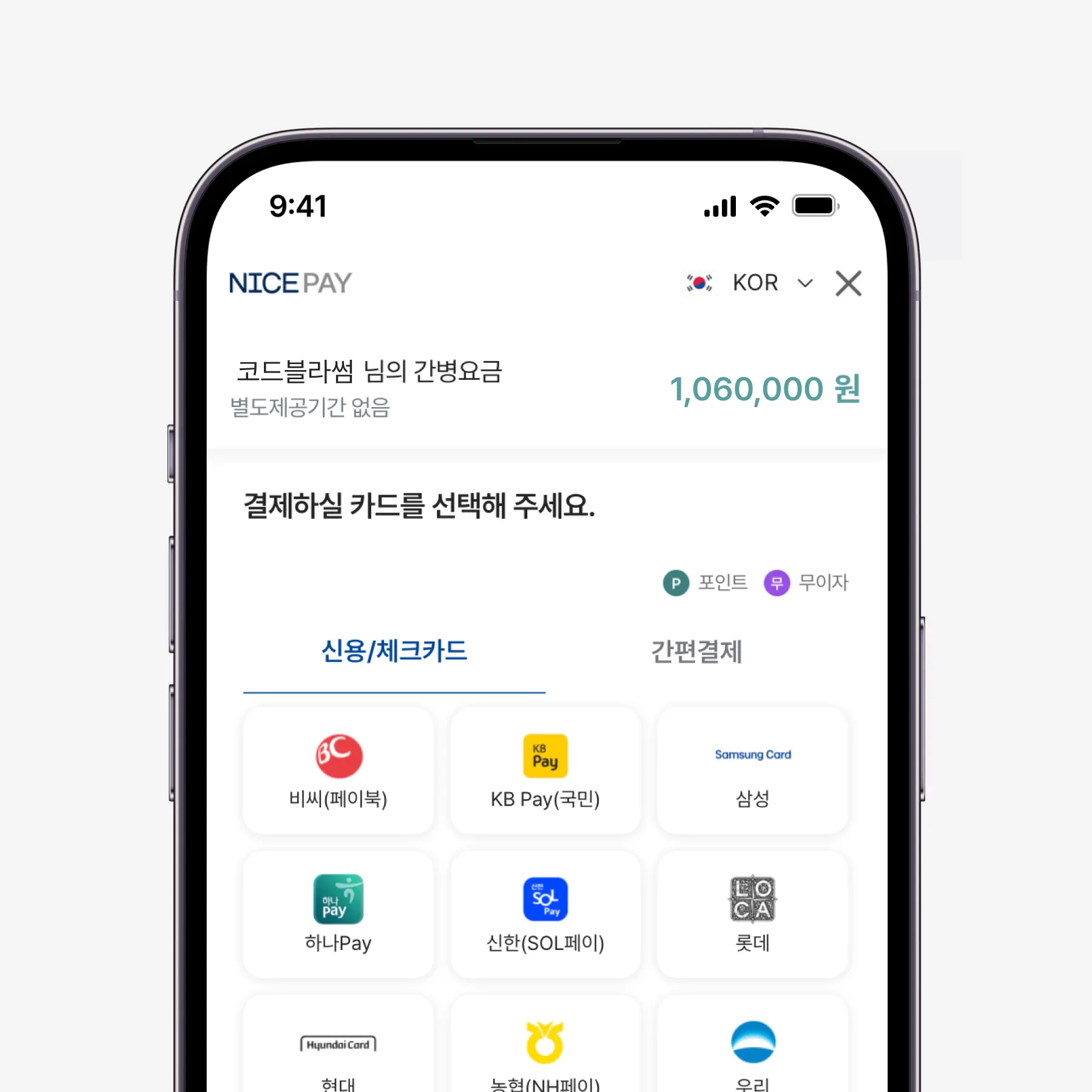 카드 결제(할부 가능), 가상 계좌, 실시간 계좌이체 등
