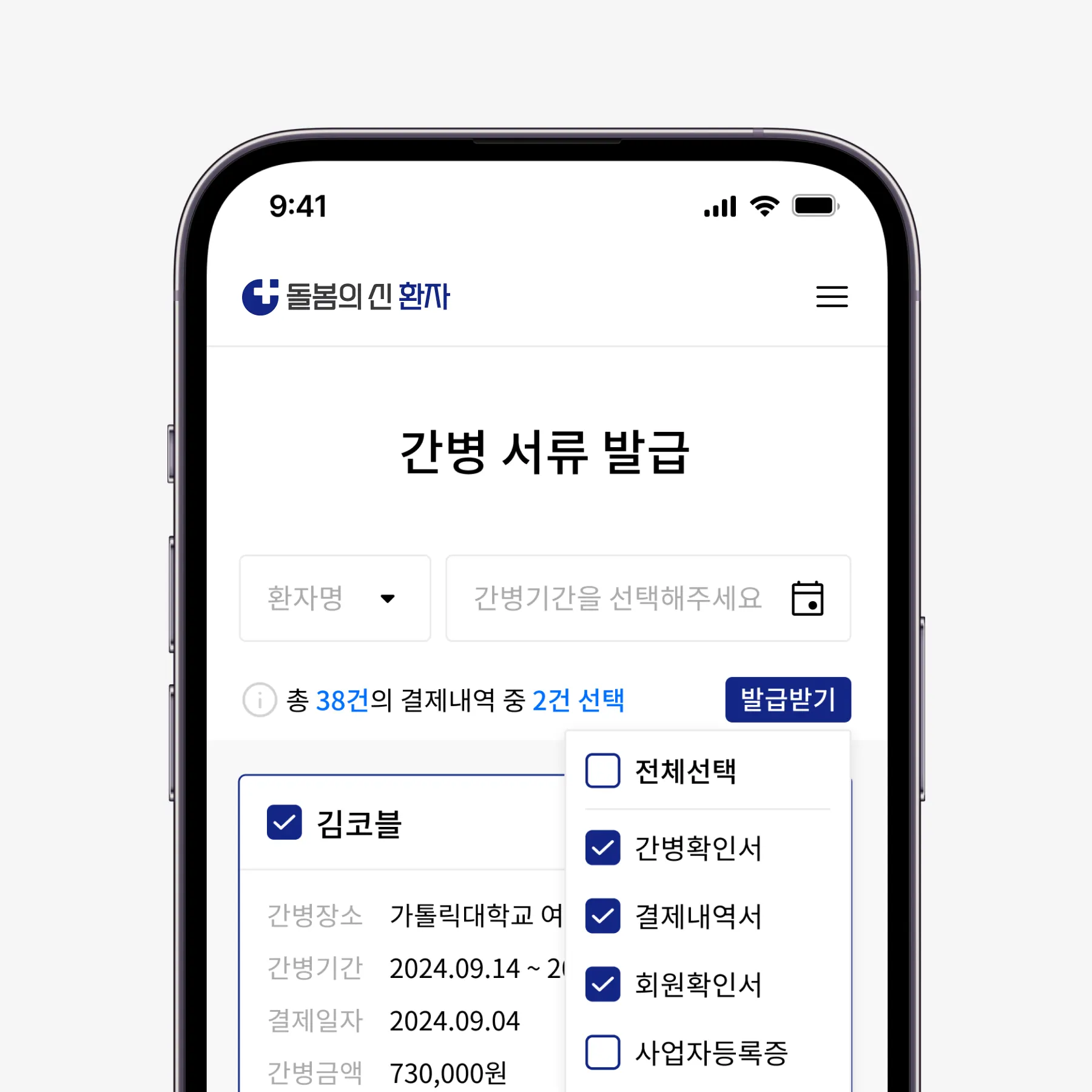 사업자등록증, 결제 내역서, 간병 확인서 등 보험 필수 서류 자동 발급